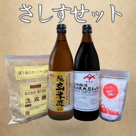 鹿北製油厳選 「さしすせット」    (洗双糖・天日塩・純玄米酢・丸大豆醤油)         ※1回のご注文につき1セットまで
